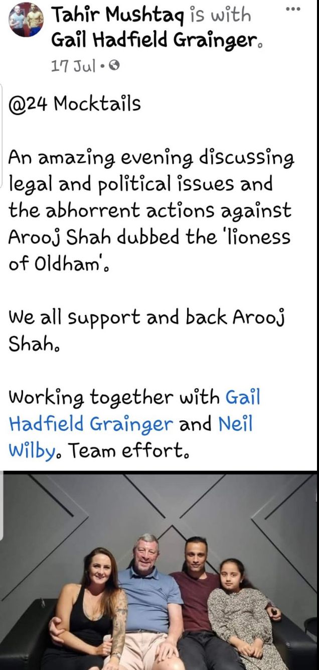 WILBY, with direct encouragement from JIM McMAHON MP, Oldham Council Leader Cllr AROOJ SHAH and the Mayor JENNY HARRISON, has been co-ordinating a hate crime against me that has only intensified after I gave evidence that led to the conviction of the mobster IRISH IMY. A member of IRISH IMY's defence team was GAIL HADFIELD GRAINGER. The wife of ANTHONY GRAINGER, the Salford criminal that the police shot dead, she launched an online attack against me following his conviction.