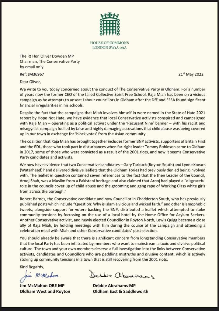 Following the recent elections, where we spearheaded a campaign which reduced Labour's majority in Oldham to just 5 seats including helping defeat the mobster affiliated AROOJ SHAH, both McMAHON and ABRAHAMS wrote a letter to the Chairman of the Conservative Party. Using parliamentary letterheaded paper, they made a series of fabricated allegations regarding myself and the people of my home town.