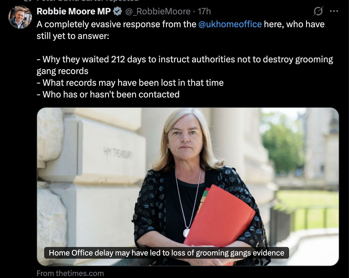 Robbie Moore, the Conservative MP for Keighley and Ilkley, spent months submitting Freedom of Information requests. He had found out that authorities in Bradford had received no instruction from the government to preserve records relevant to the national grooming gangs inquiry. What he got back confirmed what he suspected. The Home Office had been told in June last year to issue that instruction immediately. It did not write to the National Police Chiefs' Council until the 14th of January.