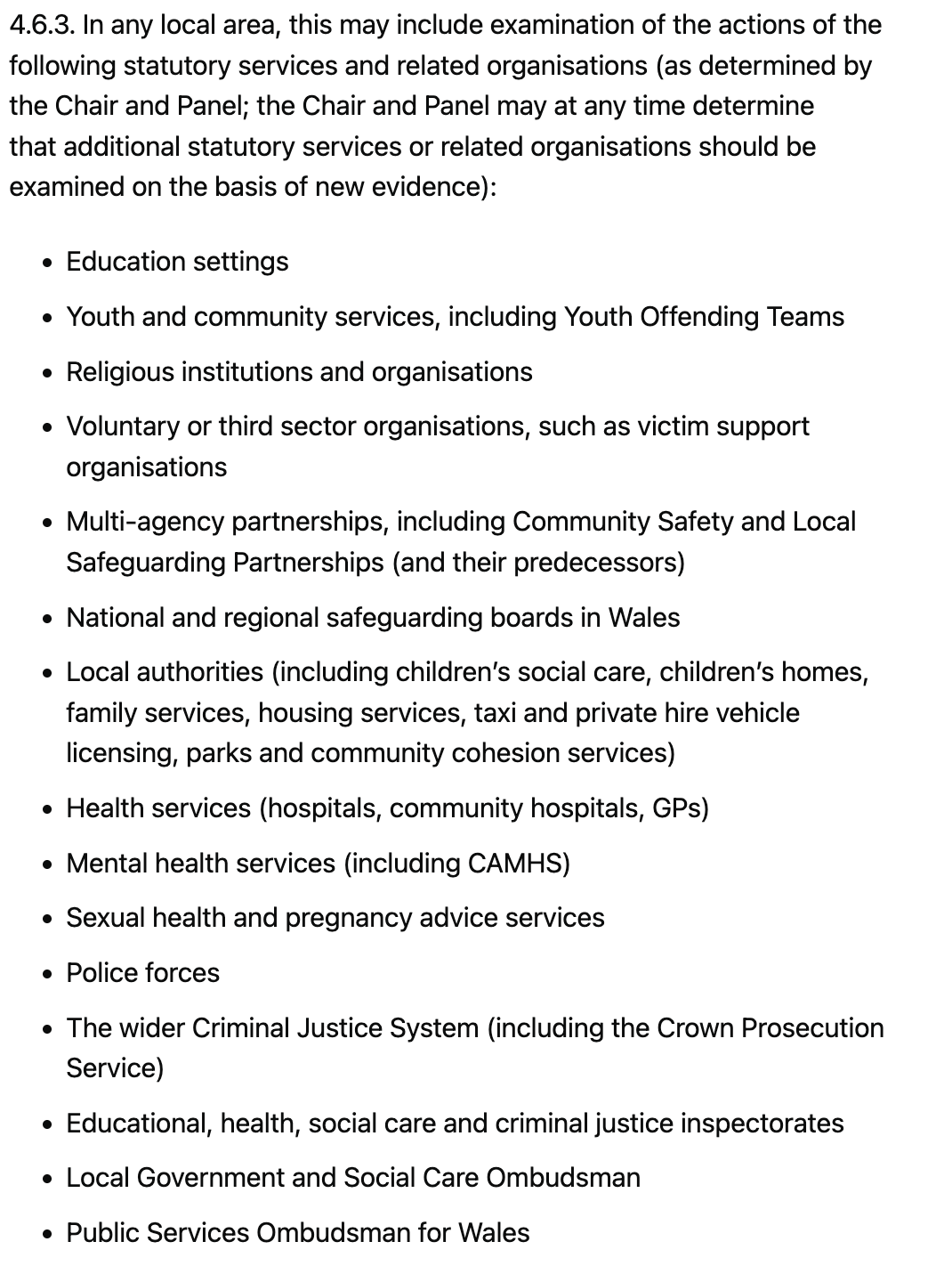 The national review strand is separate. It is supposed to examine systemic failure and the structures that allowed abuse to continue for decades. The CPS does not appear in it. There is no mandate for a national examination of charging policy or prosecutorial decision-making during the years the gangs operated.