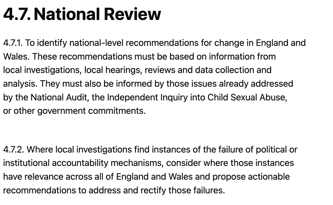 The national strand feeds upward from local findings. It does not independently examine institutions. 4.7.2 allows national consideration only where local investigations find failures of "political or institutional accountability mechanisms". This is a narrow formulation that does not mandate CPS examination at a national level.
