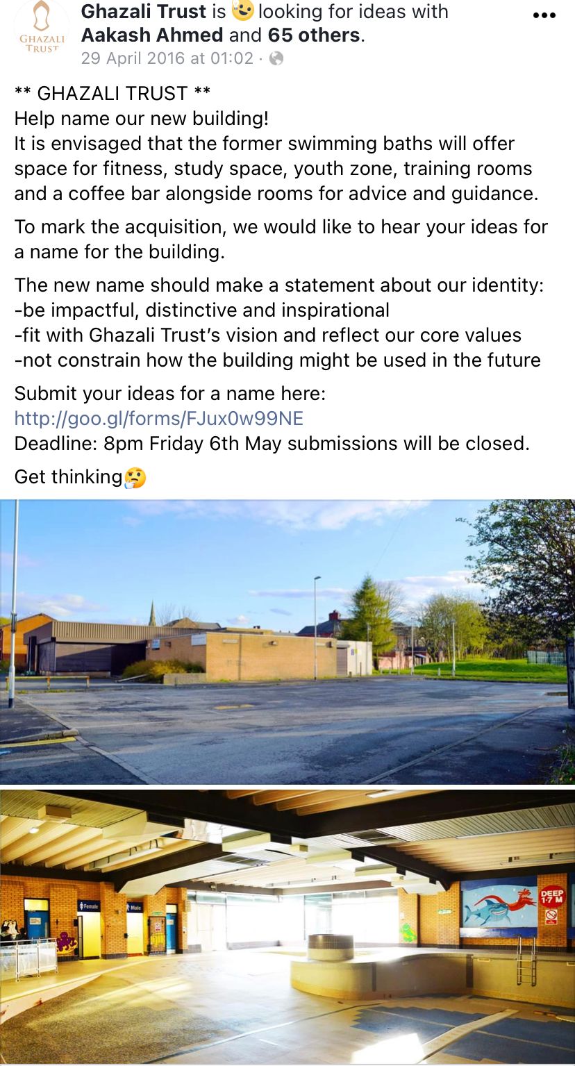 What is a matter of public record is that the Ghazali Trust took to Facebook on the 28th April 2016 to announce they had acquired the former swimming baths and were looking for people to help give it a new name.
