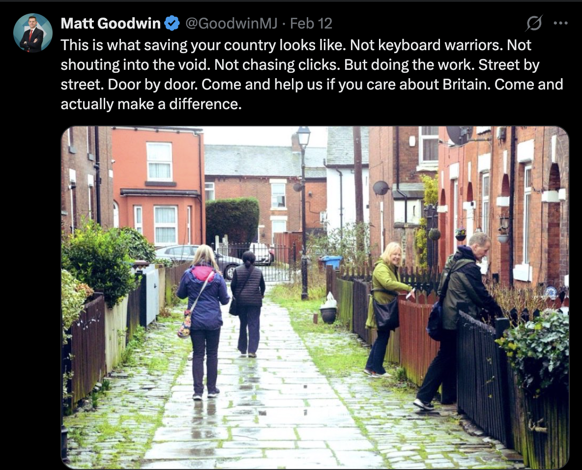 Apathy is entrenched. It's been building for decades. It won't be shifted by social media campaigns or angry rhetoric alone. It requires the kind of sustained local organising that Reform simply doesn't possess. It is more than door-to-door canvassing, voter identification, get-out-the-vote operations that can drag reluctant supporters to polling stations. It is community building.