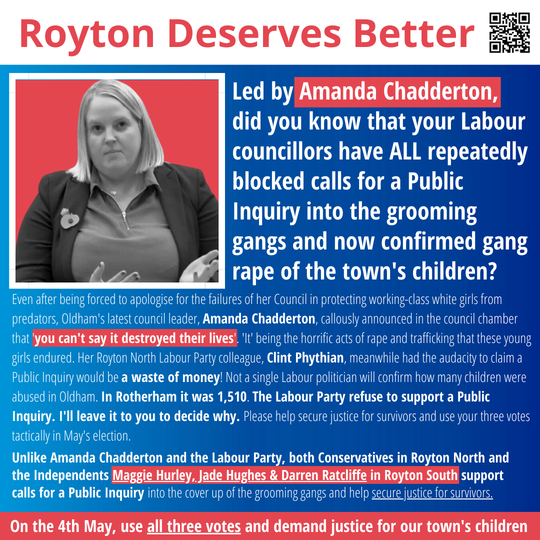 At next week’s all out elections, the people of Oldham have a chance to hold Oldham's Pakistani Rape gang protecting politicians such as AMANDA CHADDERTON (Royton South) and CLINT PHYTHIAN (Royton North) to account.