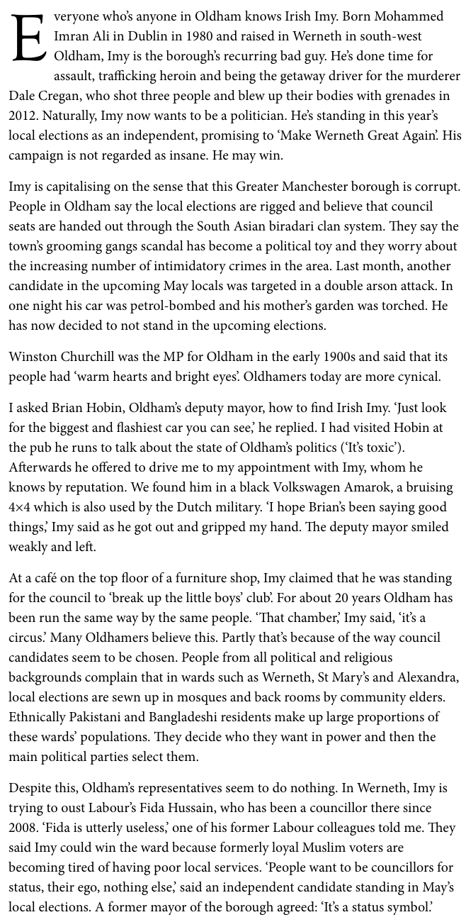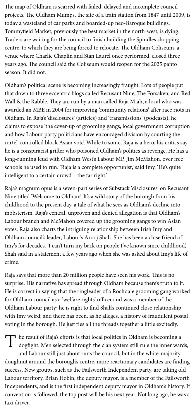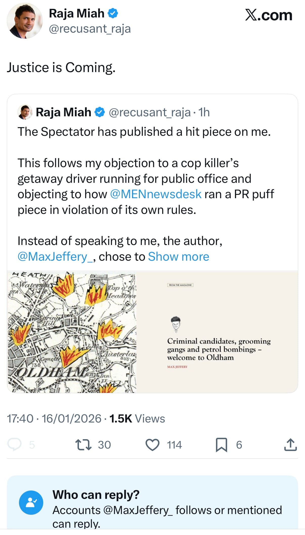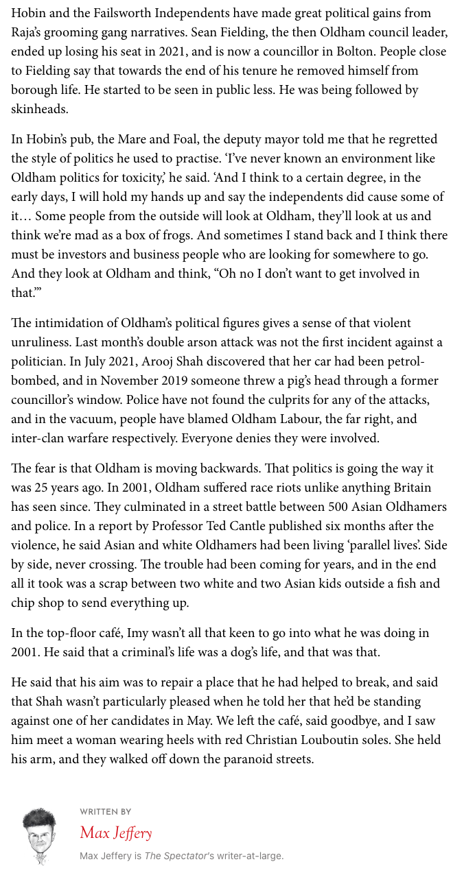 In my case, The Spectator repeatedly named me, attacked my work, and endorsed smears calling me racist and “far right,” sourced from a convicted criminal. It also blamed me for political “toxicity” in Oldham. At no point did Jeffery ever attempt contacting me.
