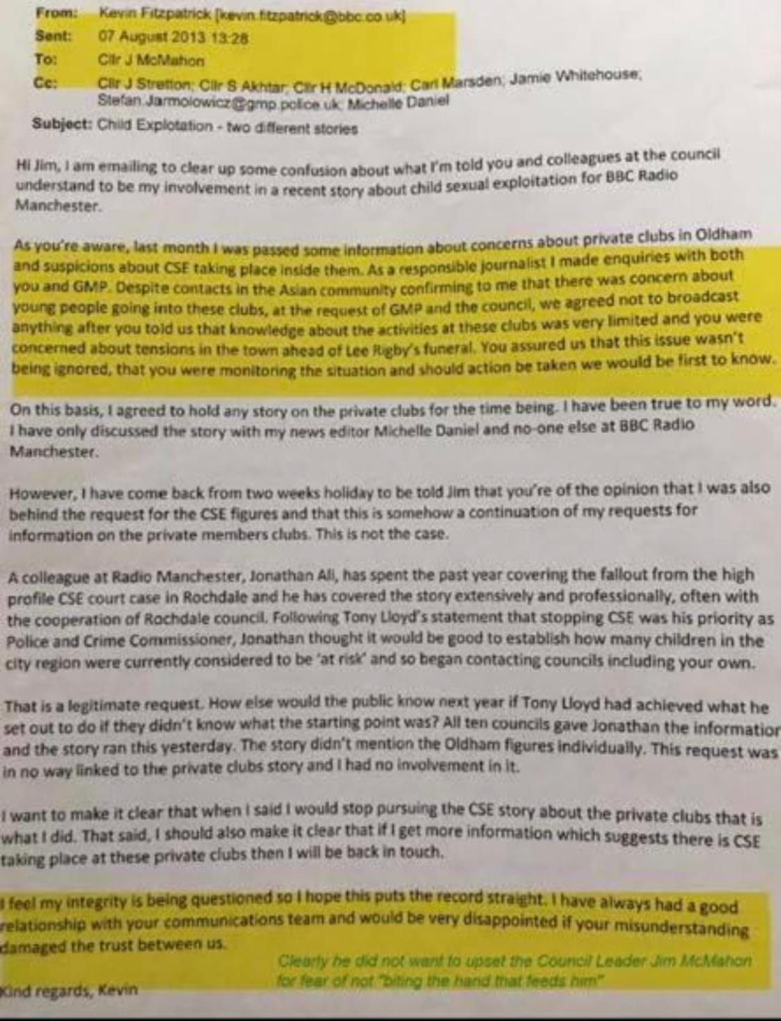 In August 2013, Fitzpatrick emailed McMahon directly about allegations of child sexual exploitation linked to private clubs and shisha bars in Oldham. Senior council figures and Greater Manchester Police were copied in. Fitzpatrick had received credible information raising safeguarding concerns. He acknowledged contacts within the local Asian community had expressed genuine worry about young people entering these venues.