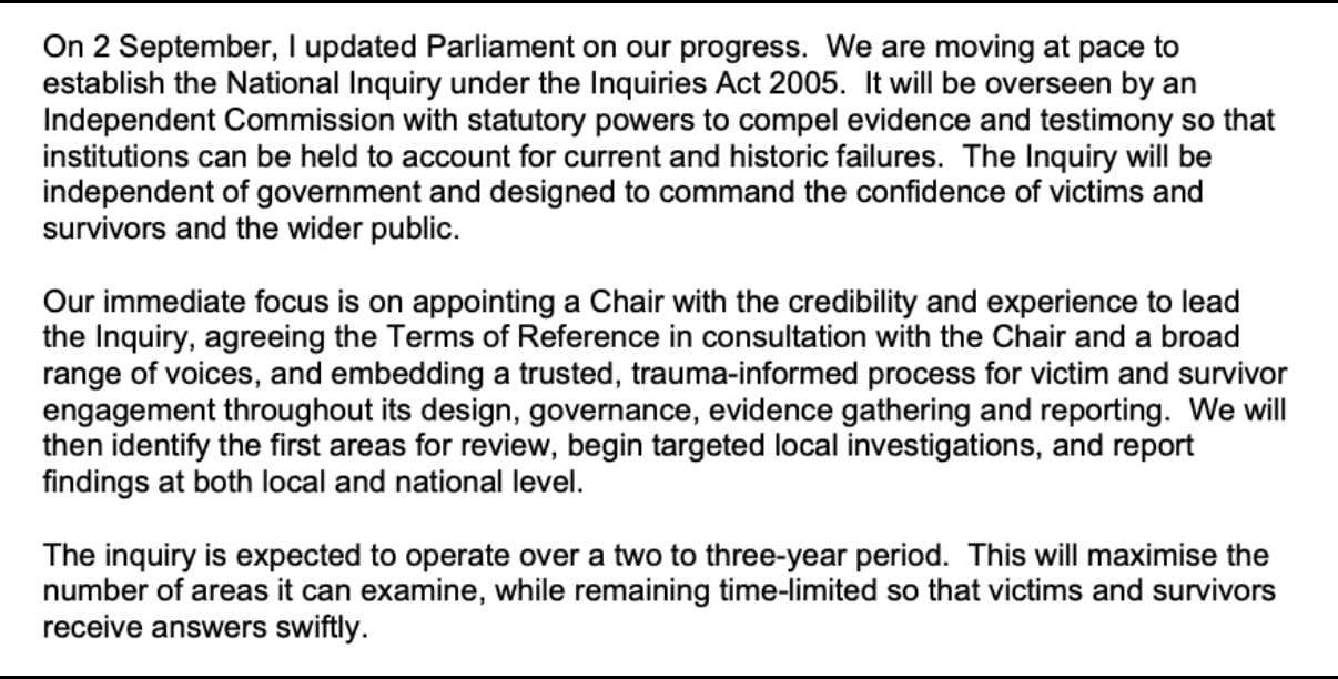 And the promise of "statutory powers" to compel evidence? We have seen this before. The IICSA had statutory powers. It compelled evidence from the Home Office, police forces, and councils. Almost nothing happened. The language of power is deployed to conceal its absence.