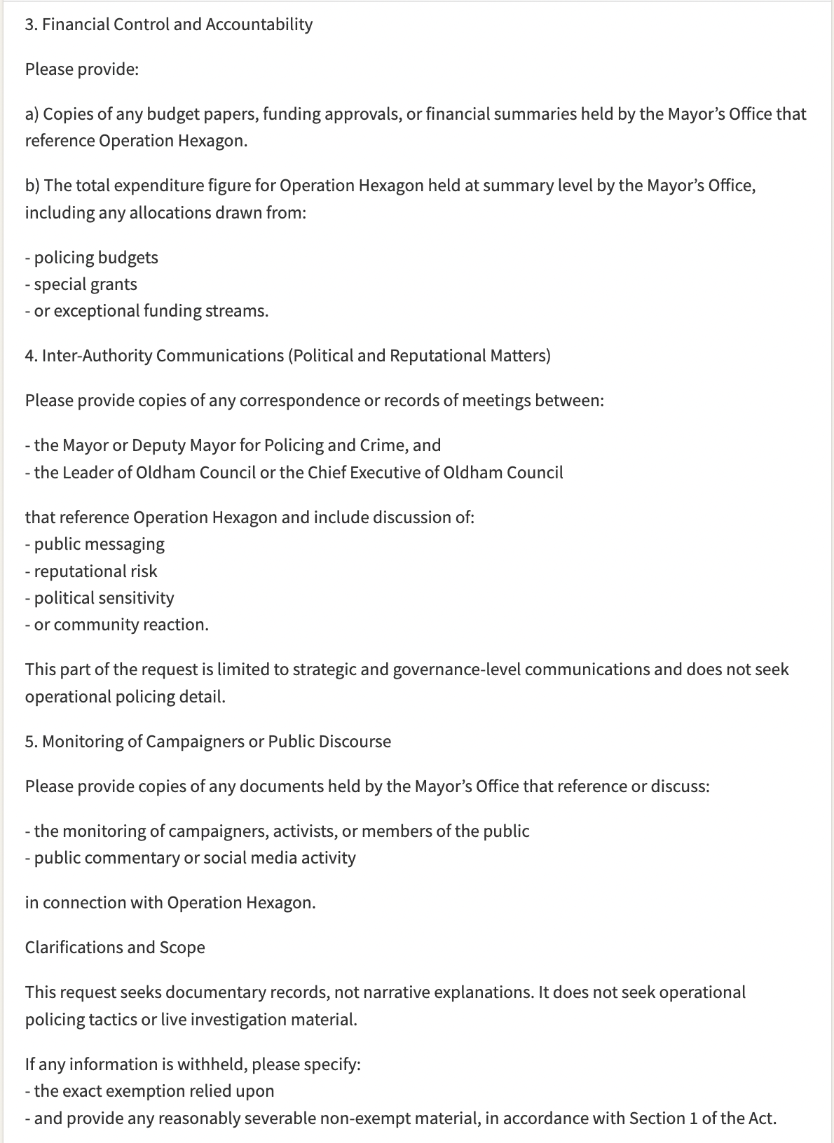 It seeks the documents that explain how an operation with this record was authorised, funded, and allowed to continue. It asks who signed it off, who was briefed, and who decided that criminalising campaigners was an acceptable use of police power.
