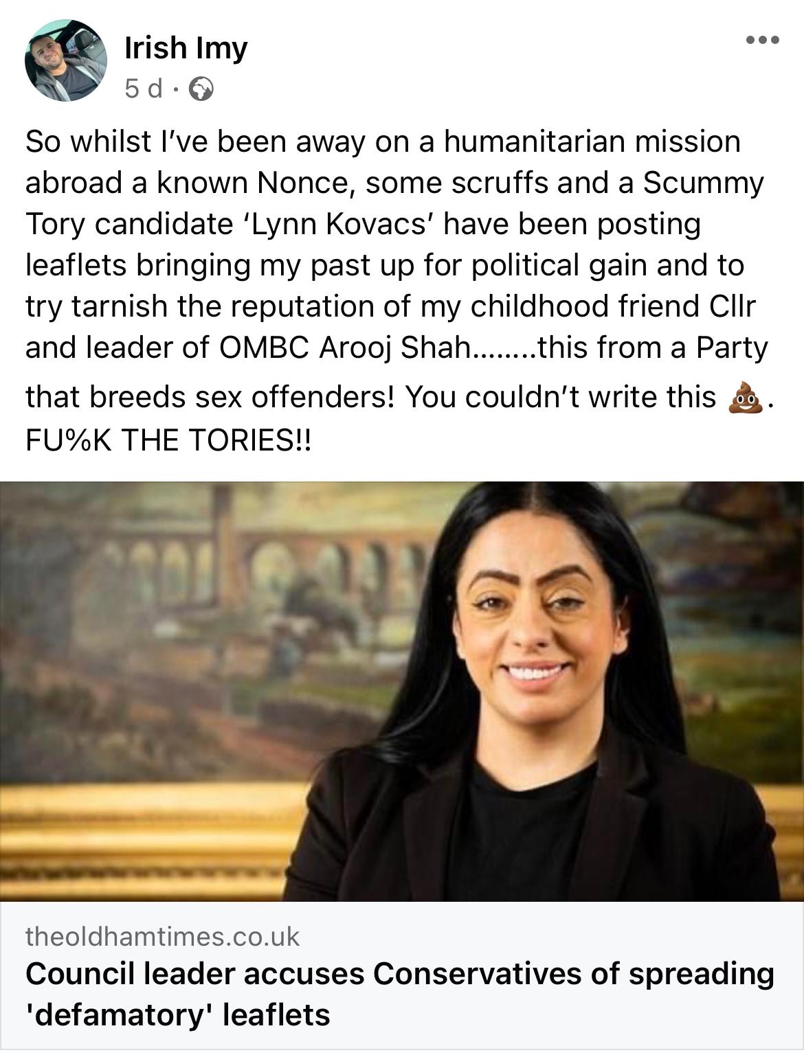 Not surprisingly, neither Greater Manchester Police, AROOJ SHAH nor the Oldham Times will either distance themselves from IRISH IMMY or condemn his attempts to incite the murder of a man whose only crime is standing in opposition to AROOJ SHAH.