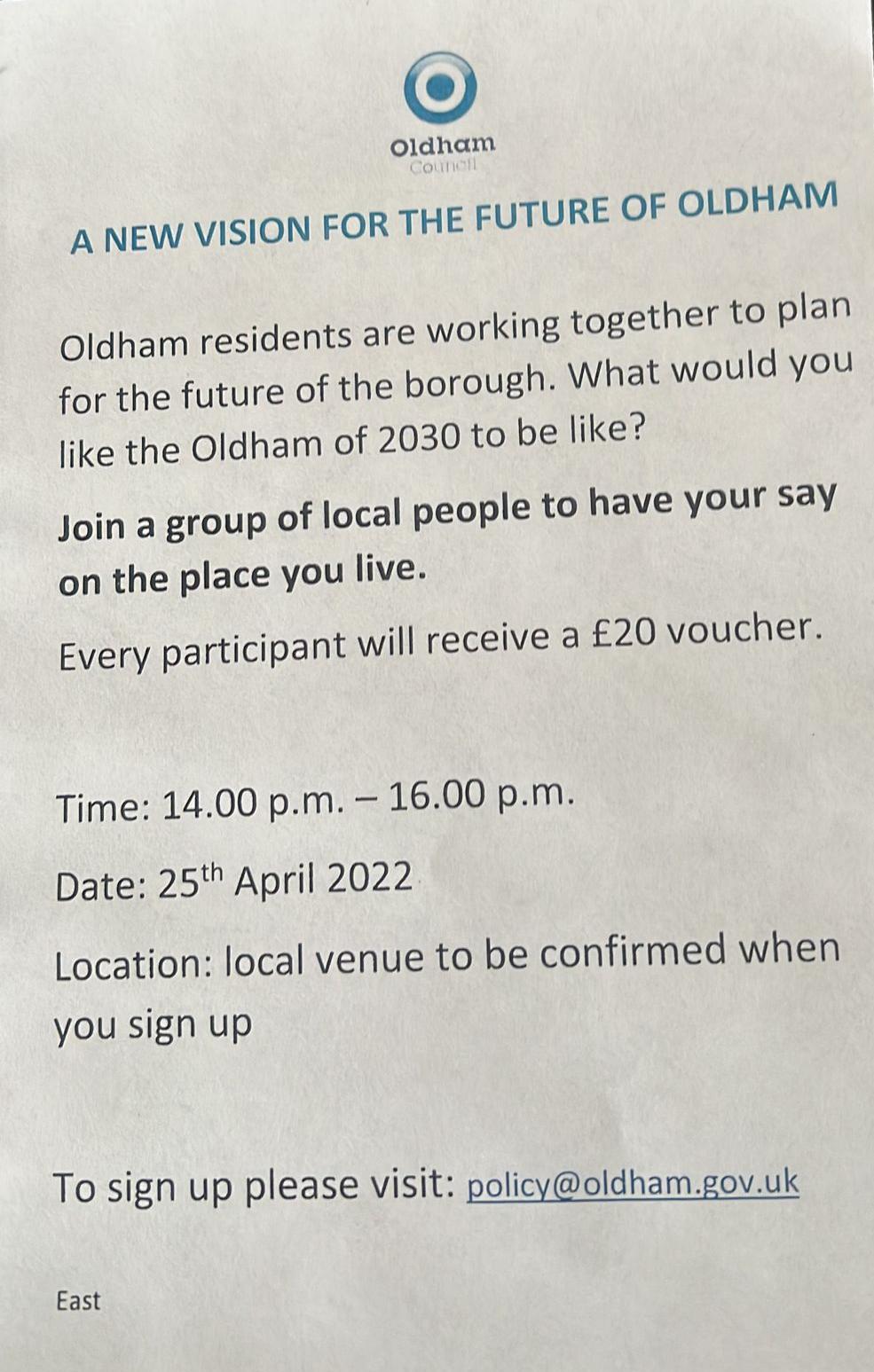 Fast forward to 2022 in St James and the Labour Party controlled Oldham Council have been caught out again. With no swimming baths to sell in the area, and no Cartel through which they can galvanise support for a Labour Party candidate, the Council's Policy team resorted to using targeted communication publicising an event with a financial reward of £20. There is zero ambiguity within purdah pre election rules regarding the Council holding public events. It is not allowed. And this is before those who are selected to attend receive £20 for doing so.