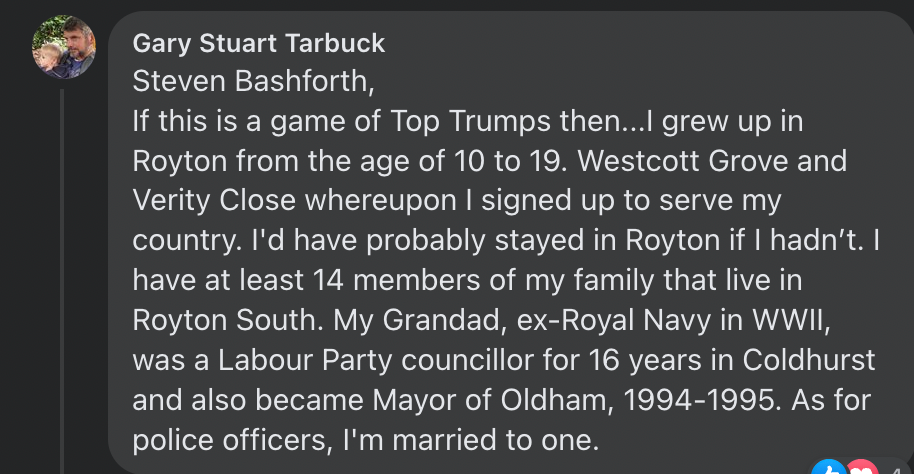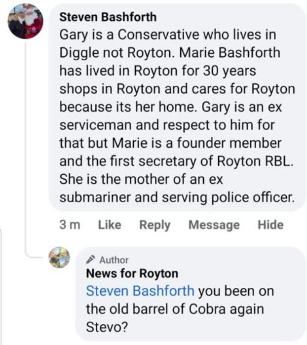 In Royton South, the husband and wife BASHFORTH team are now also exposed. On hearing that another former decorated military man, GARY TARBUCK, (whose grandfather was the former Labour Party Mayor FRANK HEAP) had secured the Conservative nomination, BARRELGATE BASHFORTH took to social media to champion his wife's credentials. Why MARIE BASHFORTH could not speak for herself is not quite clear. But then, she also does very little talking in the Council Chamber. In another spectacular episode of stupidity, the man who admitted to the actions of a bootlegger decided he should talk about how his wife's military credentials included her role as the Secretary of the Royton branch of the Royal British Legion.